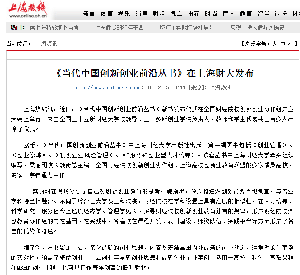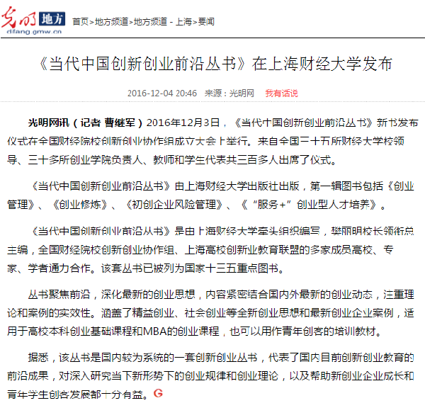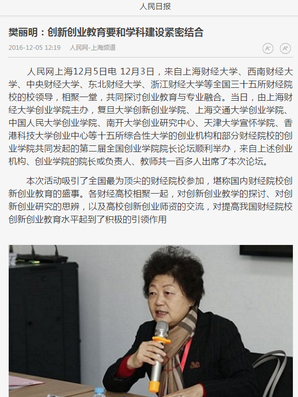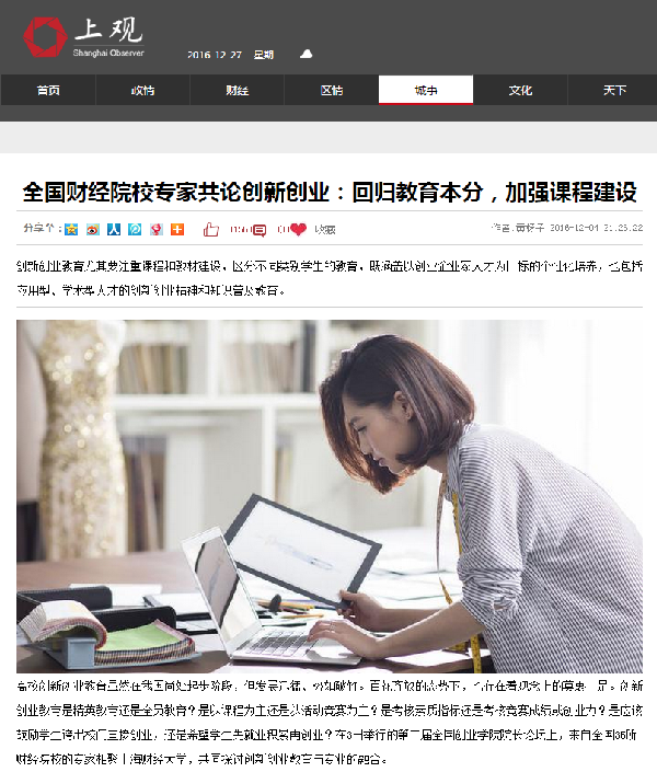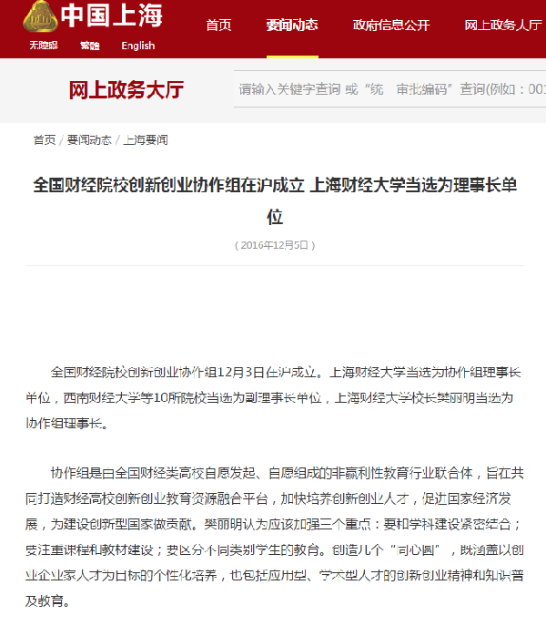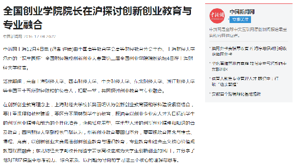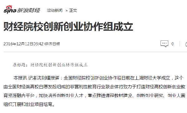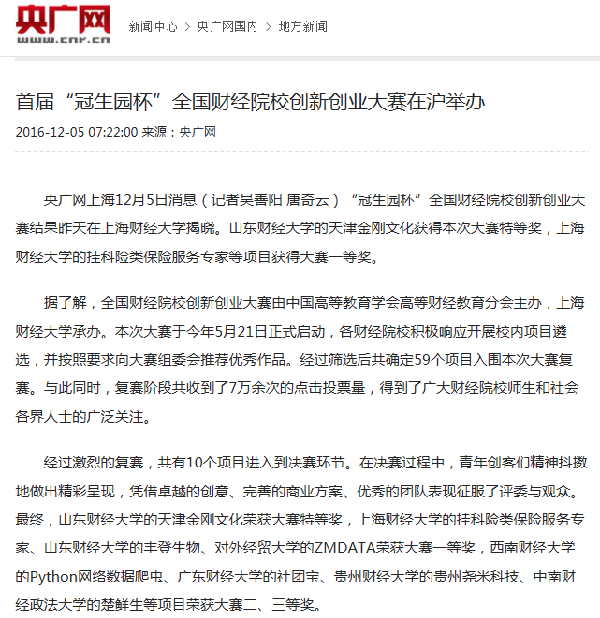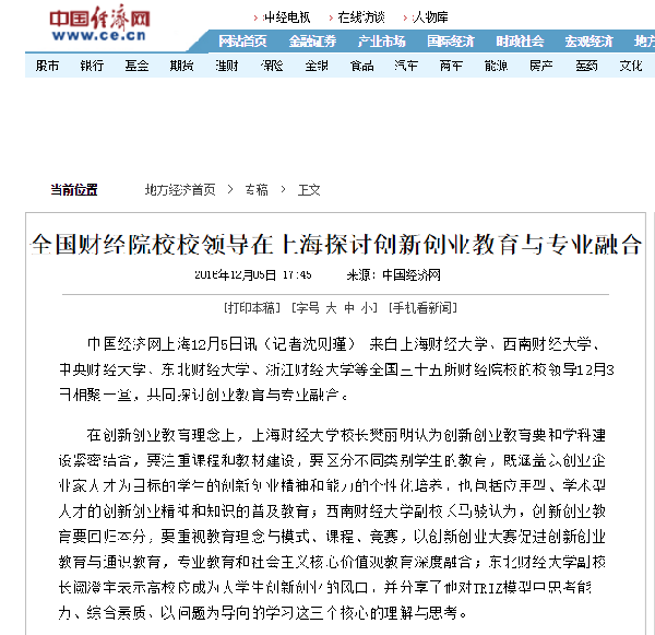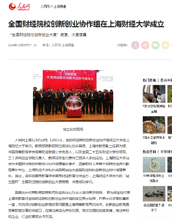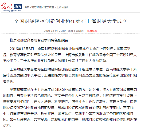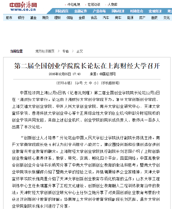 2016年12月3、4日,全国财经院校创新创业协作组成立大会、首届“冠生园杯”全国财经院校创新创业大赛暨第二届全国创业学院院长论坛在上海财经大学圆满举行。本次活动的举办得到了广大财经院校师生和社会各界人士的广泛关注,多家媒体争相报道。