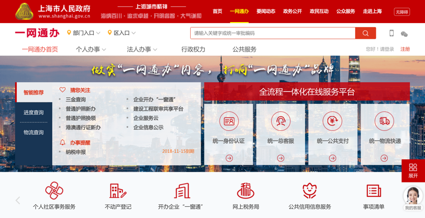上海市政府网站上,一网通办处显著位置