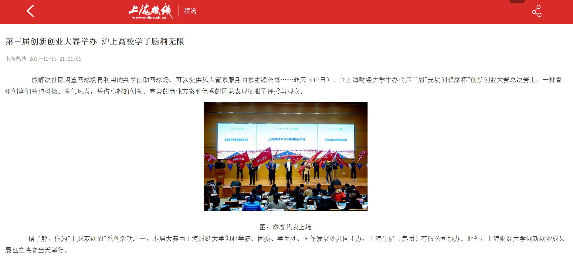 据了解,作为"上财双创周"系列活动之一,本届大赛由上海财经大学创业学院、团委、学生处、合作发展处共同主办,上海牛奶(集团)有限公司协办。此外,上海财经大学创新创业成果展也在决赛当天举行。