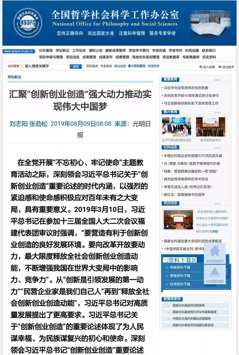 《光明日报》2019年08月09日05版刊载刘志阳教授和张劲松教授的文章《汇聚“创新创业创造”强大动力,推动实现伟大中国梦》,文章被学习强国、全国哲学社会科学规划办公室网站、人民网/中国共产党新闻网、求是网、中国网等多家央媒网站转载,特此汇总。
