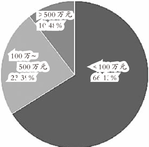 中国社会企业在员工规模、服务范围和收入水平上数值普遍偏低。调研显示,从员工规模来看,10人以下的社会企业有49.19%,10~30人的有25.40%,31~50人的有6.45%,51~100人的有6.85%,100人以上的有12.10%。从服务范围来看,22.18%的社会企业服务范围为本省,26.61%的社会企业服务范围为本市,5.65%的社会企业服务范围为本县,只有42.34%的社会企业服务范围超出了本省。从收入水平来看,66.13%的社会企业年收入不到100万元,23.39%的社会企业年收入在100万~500万元,年收入在500万元以上的社会企业占比仅有10.48%。(如图二)