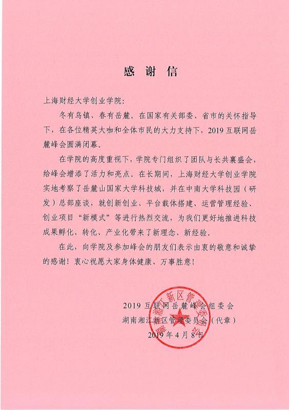 2019互联网岳麓峰会于4月1日-3日在长沙举办。应岳麓峰会主办方邀请,上海财经大学创业学院匡时班学员参加了本次活动,受到了长沙市委副书记朱健的热情接见。在岳麓峰会圆满闭幕后,组委会向我院发来感谢信。