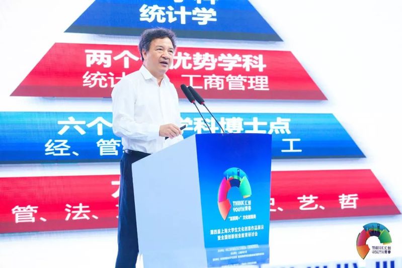 桑标院长代表市教委发言,他在致辞中向我校承办本次活动表示感谢!他认为,上海市教委打造的“汇创青春”大学生文化创意产品展示活动,既顺应了国家大力倡导的创新创业教育,又与上海建设成为国际文化大都市的目标相契合,集中展示了当代大学生在文化艺术领域的精彩创意,初步形成了文化创意产教融合的新机制,是推动大学生创新创业教育的重要抓手。