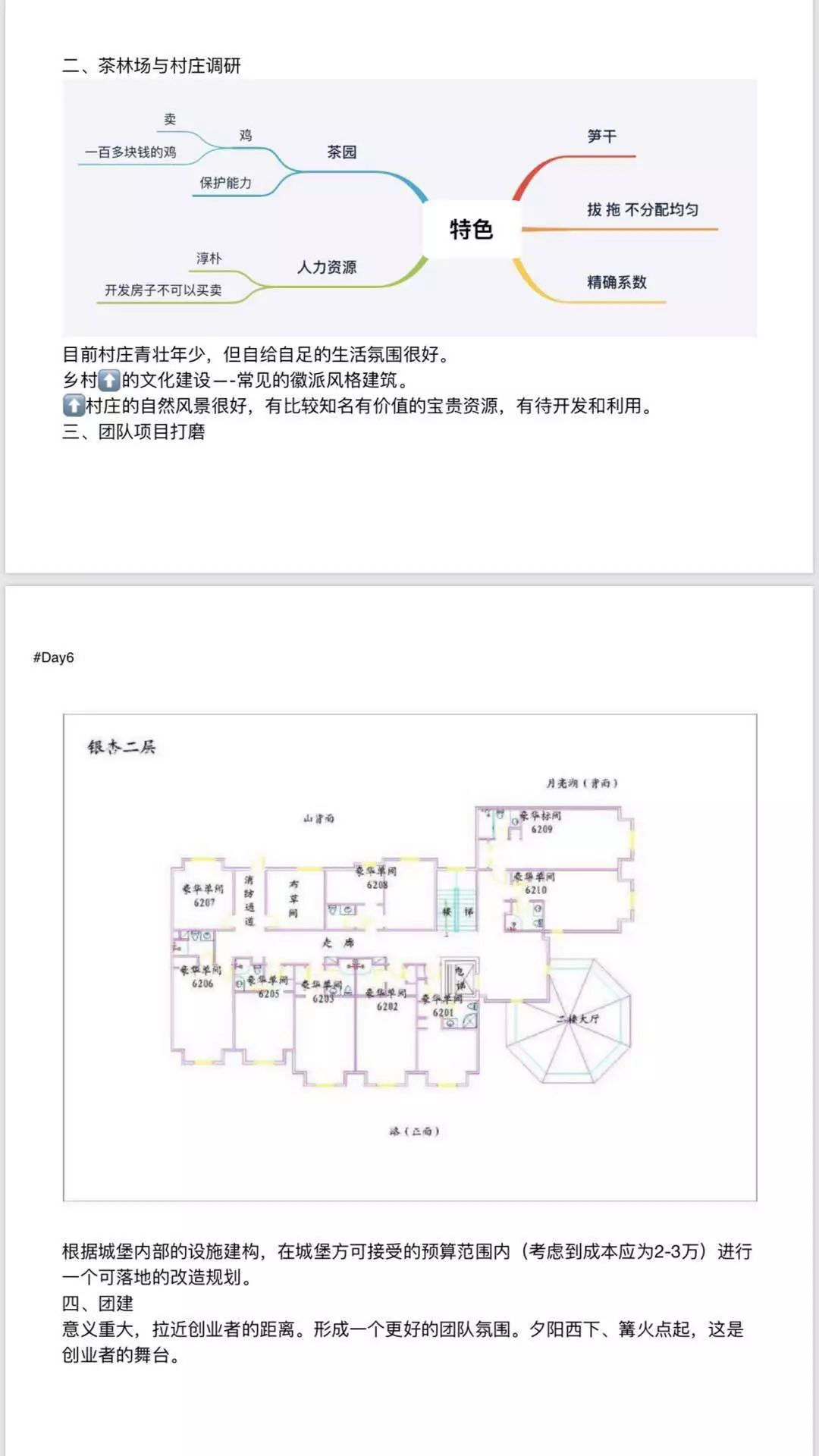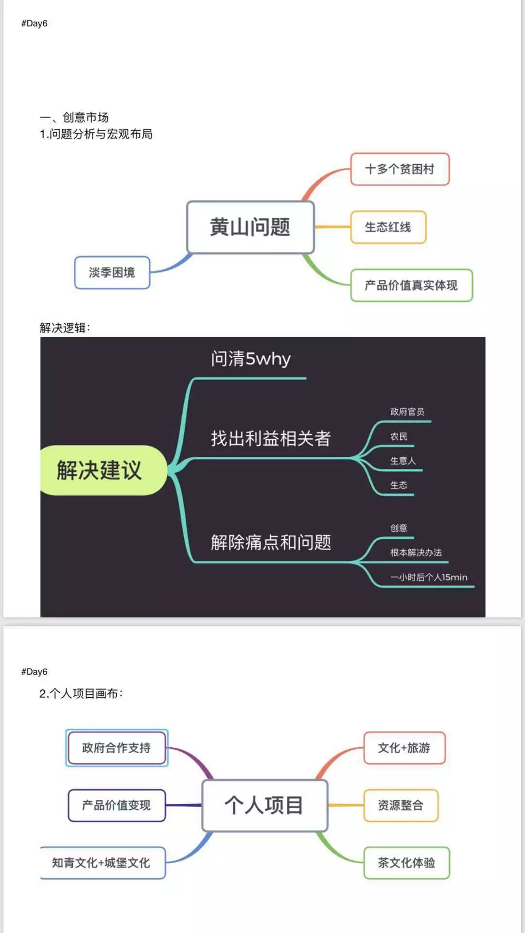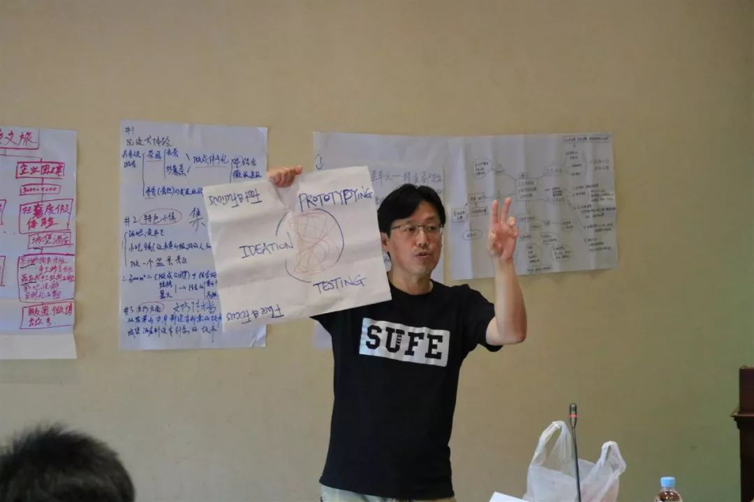 上午,施老师的创意集市课程。针对东黄山的实际情况,寻找解决问题的切入点。首先是团队讨论,通过FIVE WHYs工具反复思考,找出问题的症结。然后写出自己个人的创意想法,并做宣讲。接着,通过进村、进厂、进实地考察。