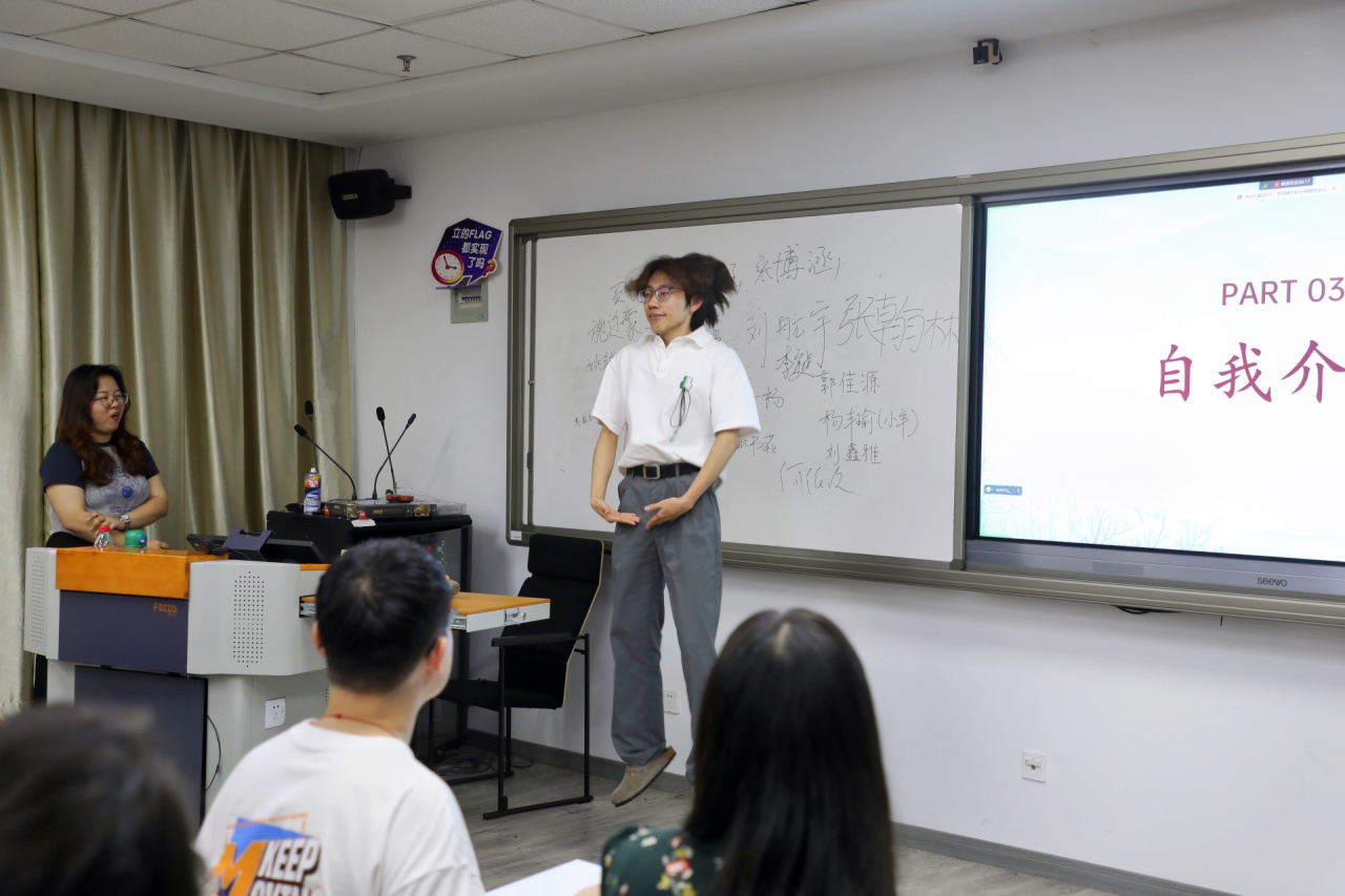 在自我介绍环节,同学们依次上台介绍自己的年级、专业、爱好......一个个名字从陌生到熟悉,一张张面孔烙印在了脑海。这个环节不仅让同学们相互认识,也让大家感受到了班级的多元化和充满活力的氛围。特别的是,有同学在同伴的支持和鼓励下,展现出自己独特又精湛的才能,获得满堂掌声和赞许。