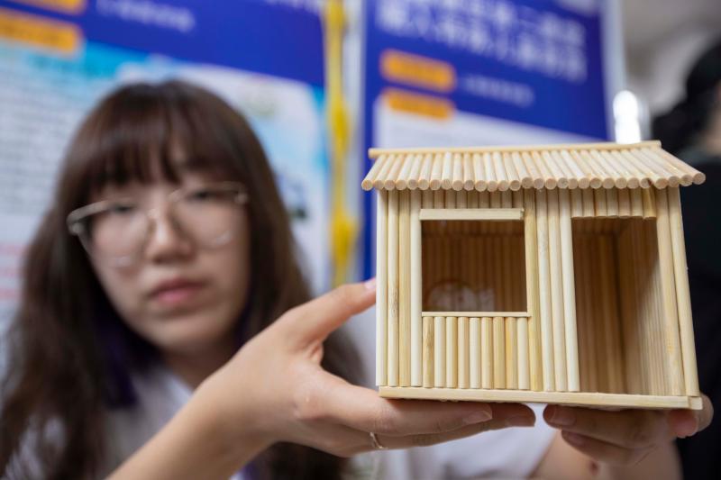 一名大学生在展示其制作的秸秆工艺品。