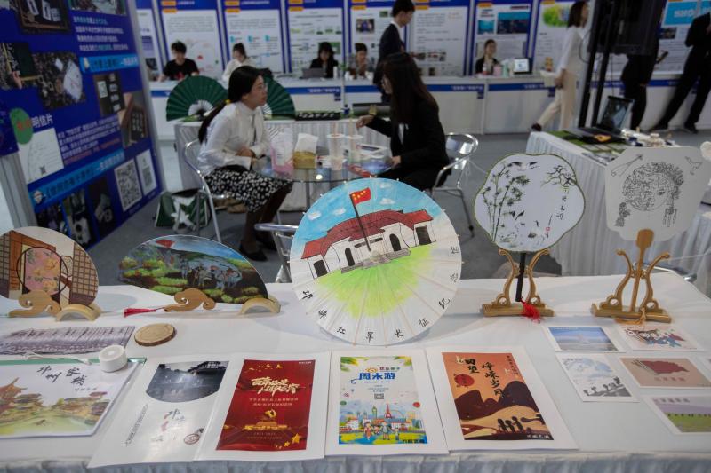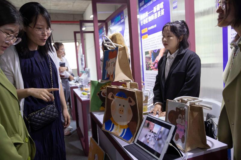 创业者正在向参观者介绍自己的创意手绘产品。