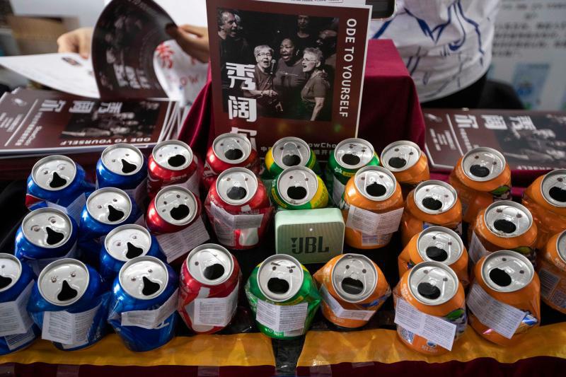 上海音乐学院的学生创业者为老年人打造的合唱团项目,每个易拉罐都是一个“表情包”。