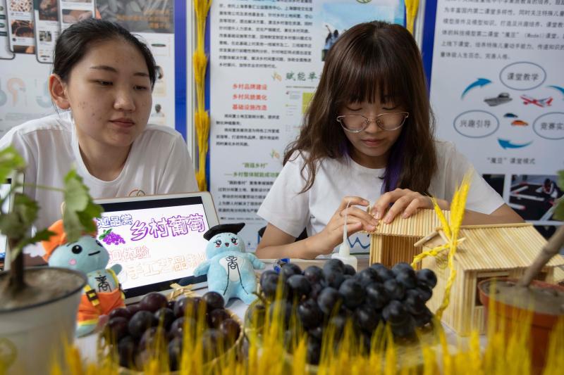 一名大学生在用秸秆制作工艺品,为新农村旅游经济提供更多思路。