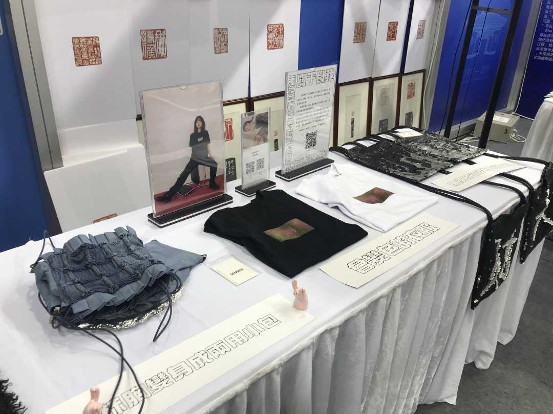 上海财经大学学生陈悦欣设计的抹胸变身两用小包、胸前图案会变色的T恤和抚摸一下就能变成不同图案的亮片包