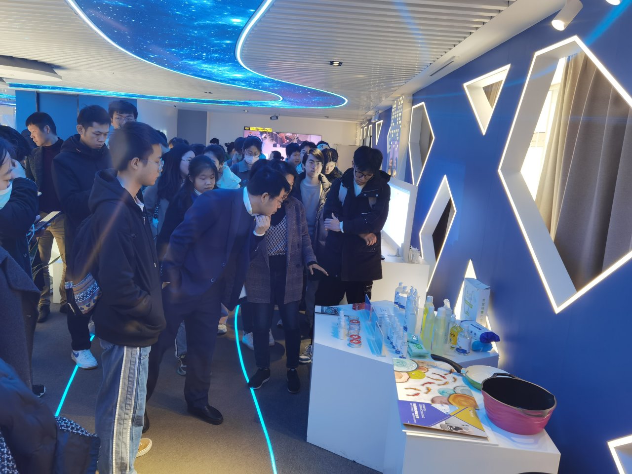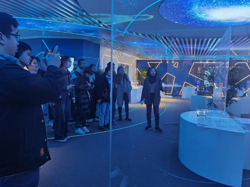 联创港负责人对前沿师生的到来表示欢迎,在对园区的情况简单介绍后,带领师生们参观松江联动创新应用成果展厅,展示并讲解了众多在该园区落地的企业的代表性前沿科技成果,例如裸眼3D,虹膜技术,偷拍溯源技术,科大讯飞语音鼠标语音键盘,中科极光RGB纯激光电视等,让师生们了解到前沿科技的发展状况。