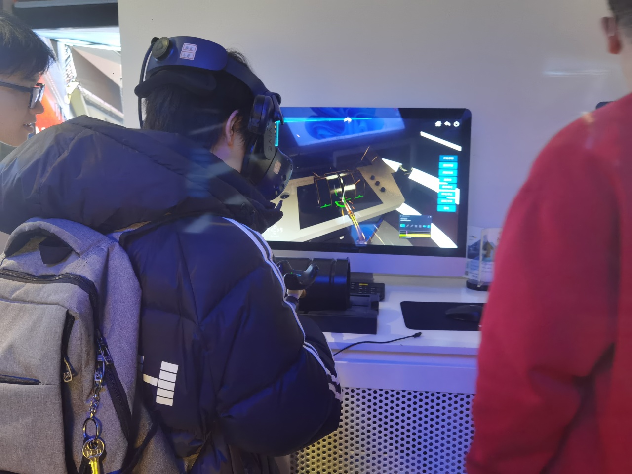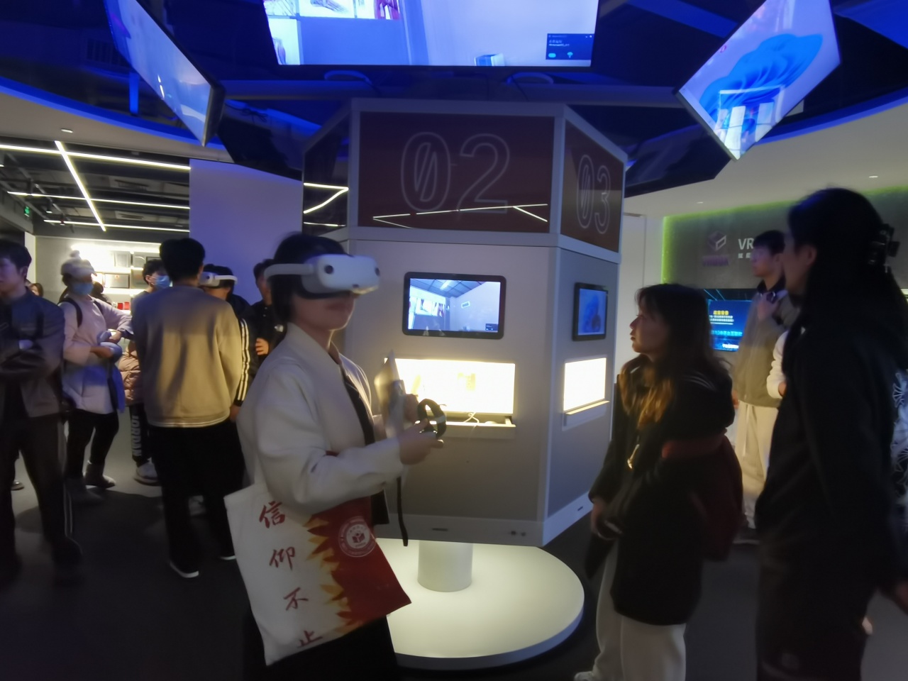 随后,同学们在体验室沉浸式体验了曼恒数字研发的VR产品,让同学们戴上VR设备切身体验火灾发生时的应急处理、VR沉浸式游戏以及VR沉浸式党史学习等。