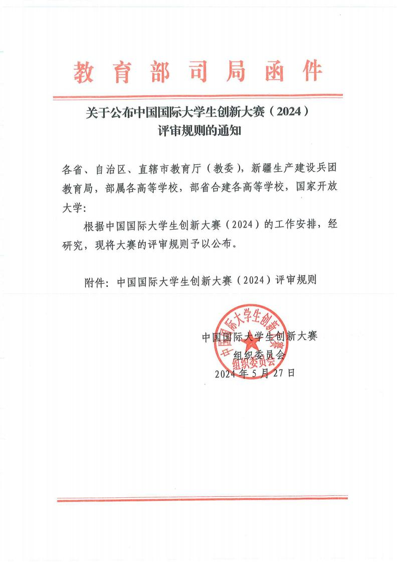 中国国际大学生创新大赛(2024)评审规则已发布,详见附件。