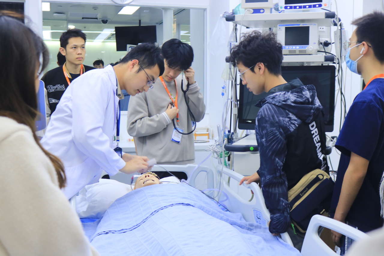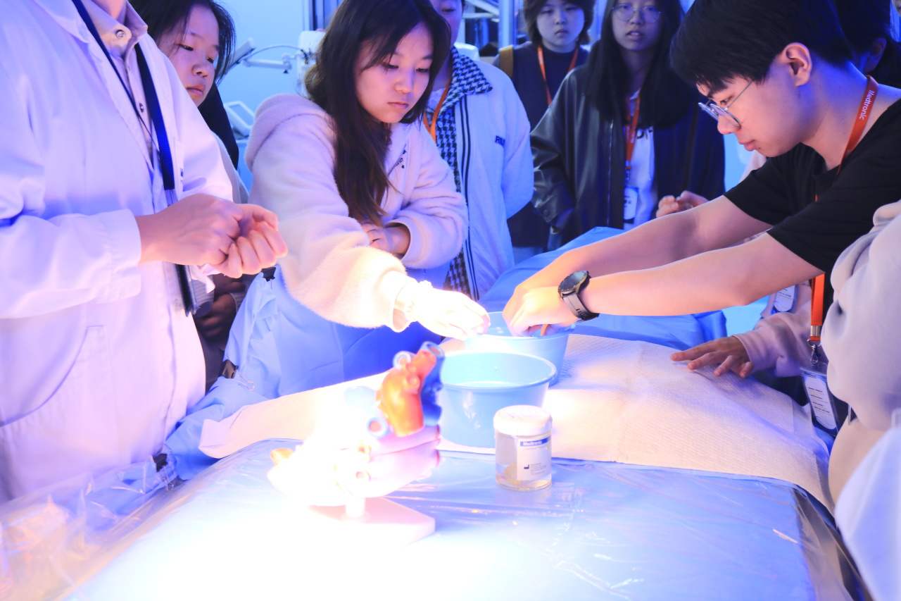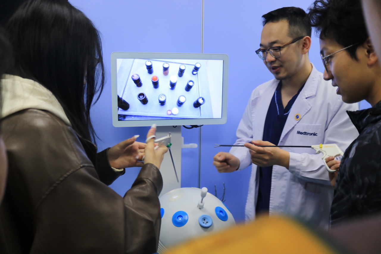 随后,师生们在工作人员的带领下先后来到创新中心的二楼和四楼的模拟区。在内科模拟手术室,同学们两两合作,模拟进行腹(胸)腔镜手术操作,既考验了学生的动手能力,也通过具体的操作对手术深入了解。
