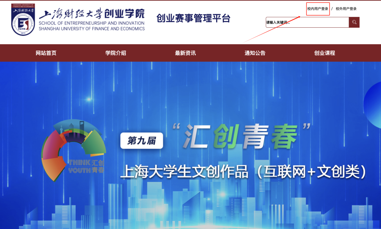 在浏览器搜索框内输入https://cs.sufe.edu.cn/index.phtml,登录上财创业学院创业赛事管理平台,点击“校内用户登录”。