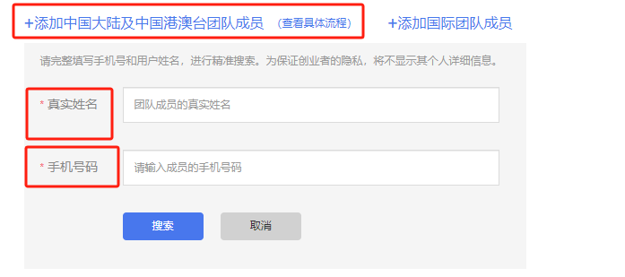 添加大陆及港澳台团队成员,注意需要确保其在大学生创业服务网完成注册核验,可点击“查看具体流程”了解。