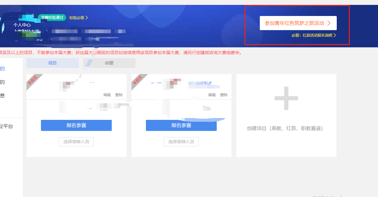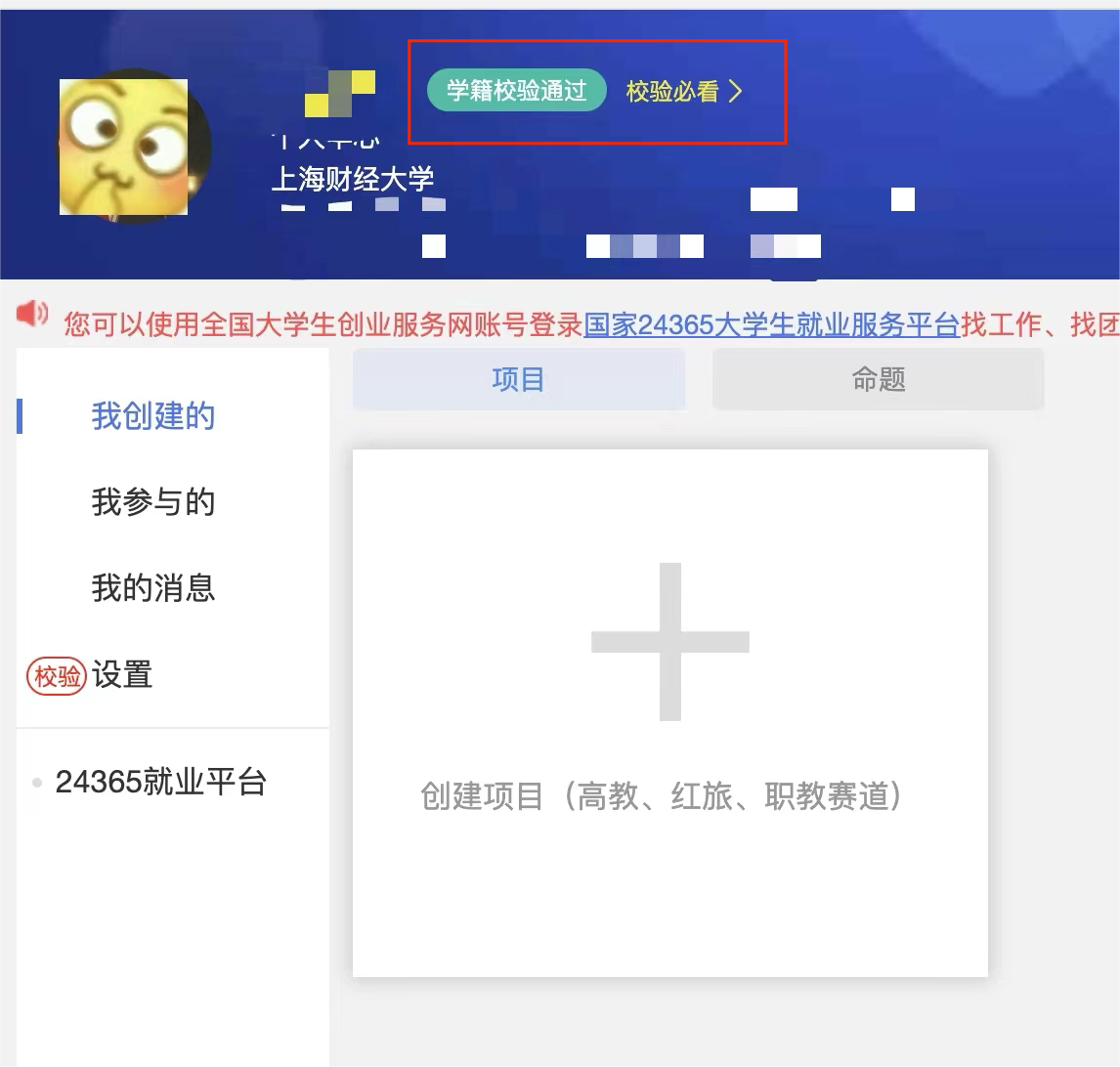 需完善个人信息并进行学籍学历信息验证,验证成功后可进行项目创建。