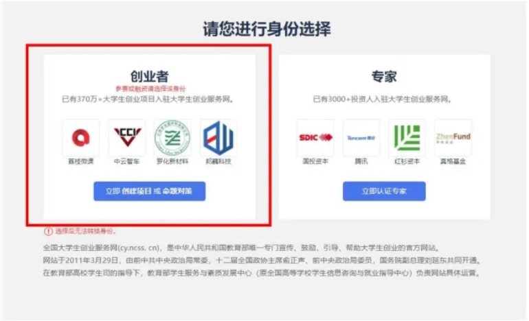 点击立即创建项目成为创业者,身份选择前请再次确认所选身份,选择后将无法进行身份转换。