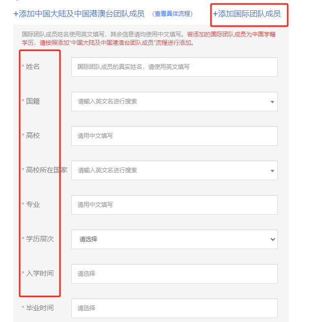 2.若添加的国际团队成员为中国学籍学历,请按照添加“中国大陆及中国港澳台团队成员”流程进行添加。