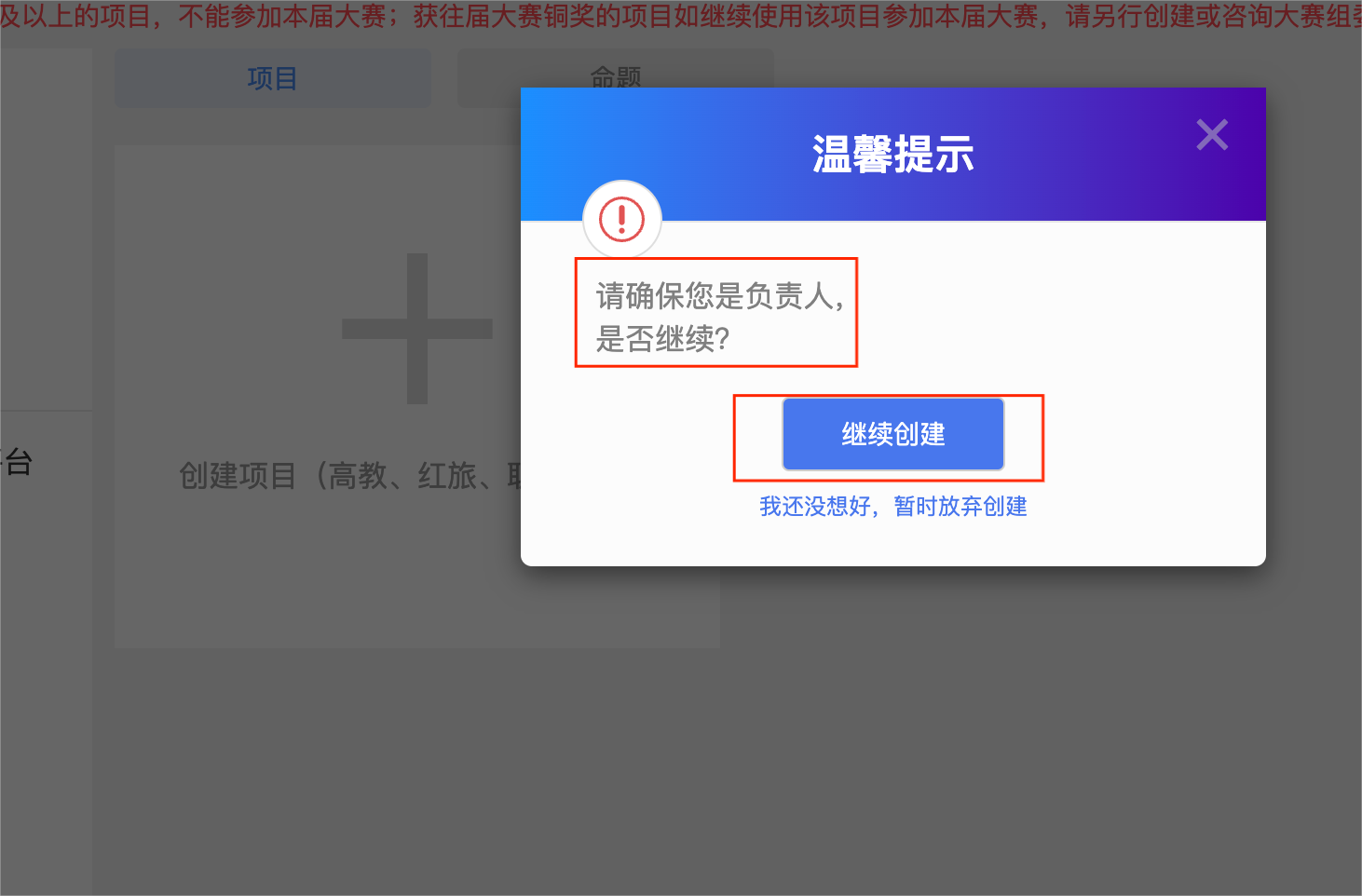 点击“创建项目”,确认为负责人后,点击“继续创建”开始创建项目。
