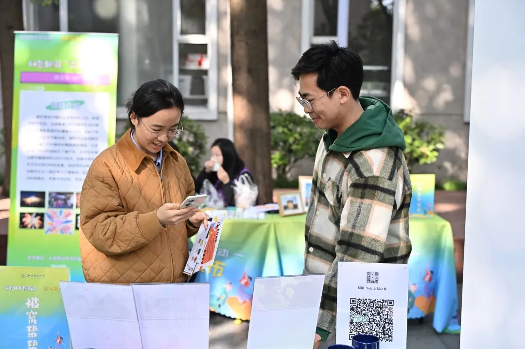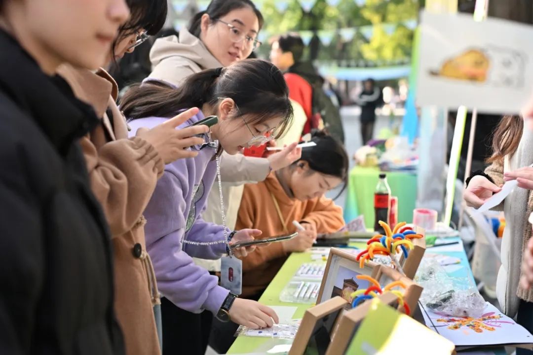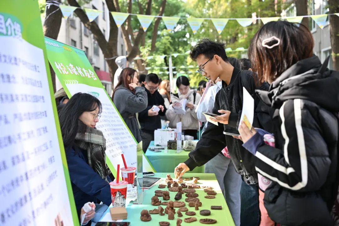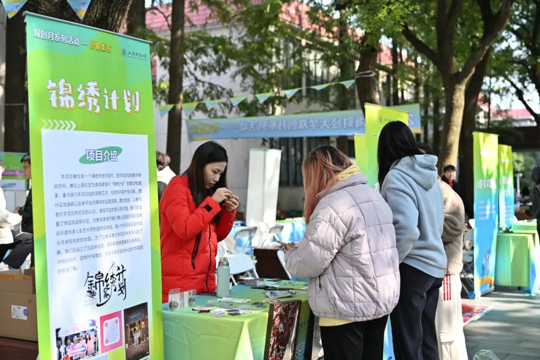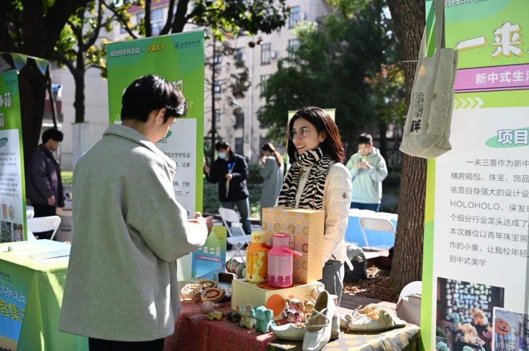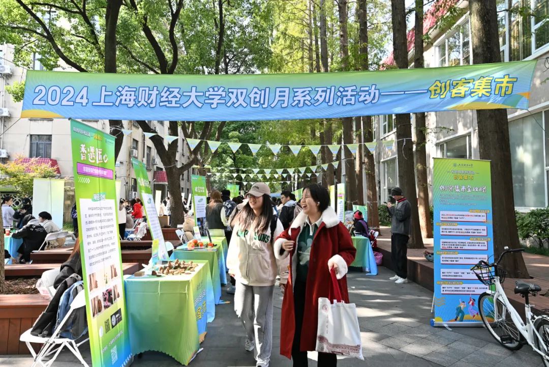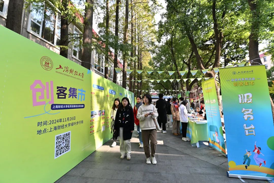 11月26日,上海财经大学双创月系列活动-创客集市在绿叶步行街举办,本次创客集市,以“五区联动,共创未来”为主题,精心策划并设置了项目展示区、创业展位区、非遗手作区、创业服务区及互动体验区,通过创业项目展示、创业资源交流及创业服务支持,打造了一个集中展示平台,充分展现了我校学生的创新思维和创业热情,集市共展出24个展位,300余名师生参与。