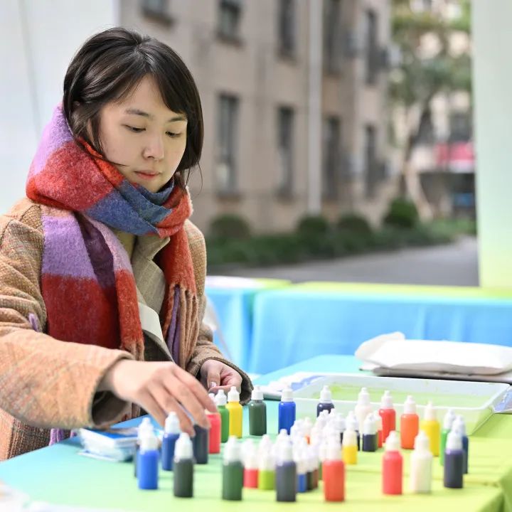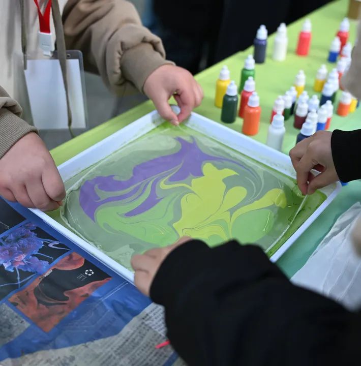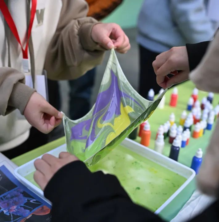 从“烟花元宇宙”的3D烟花全息投影到“锦绣计划”的苗绣文化展示再到“水拓丝巾”的水拓画技艺,在非遗手作区,参与同学在亲身体验中与非遗邂逅,感受创客们对传统手工艺的传承和创新。