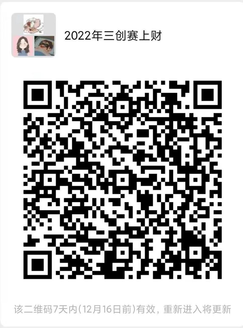 学校拟于2022年3-4月进行本届“三创赛”的校级选拔培优工作,届时要求参赛团队提交创业计划书、项目路演PPT等,后续比赛等相关事项将另行具体通知。请有意参加的团队加入微信群: