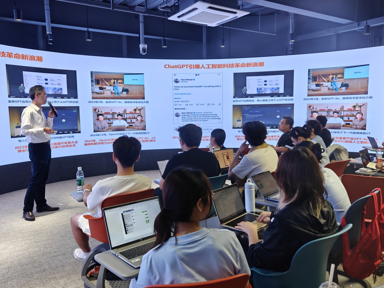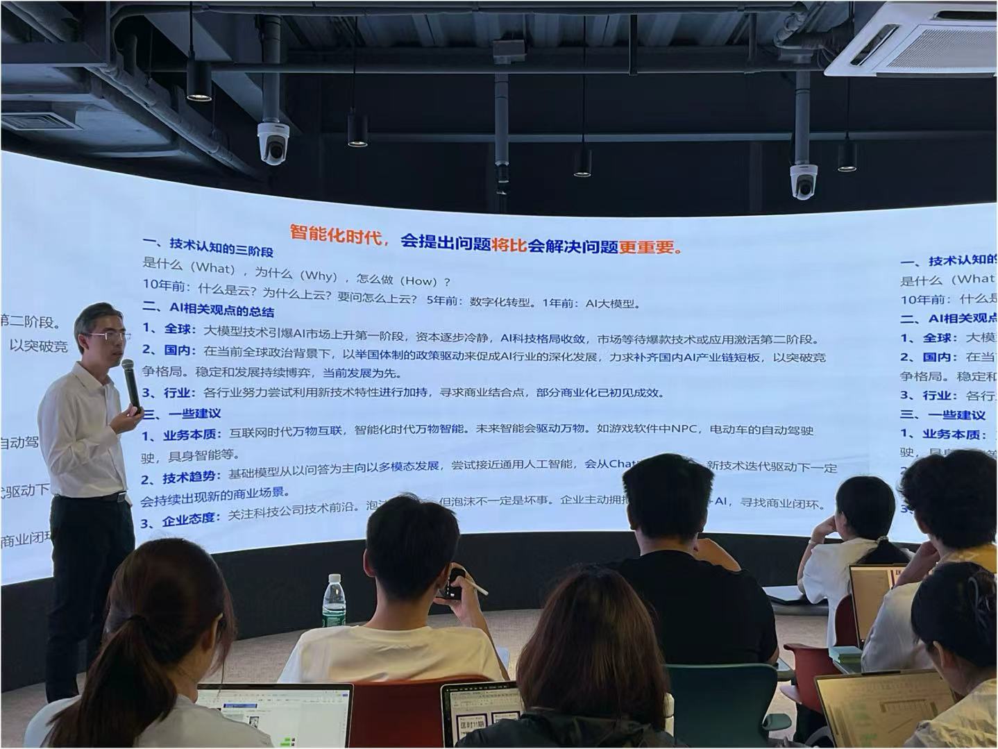 下午,首先由张振华老师为同学们带来了《人工智能技术发展趋势及行业场景融合》的课题学习。课程深入追溯了全球人工智能的发展脉络,从 1950 年至 2025 年,人工智能在三次科技浪潮的洗礼下,从传统电信网络、PC 电脑时代,一路发展到如今的 5G、IOT 时代,市值不断攀升,开启了数字经济的新篇章。
