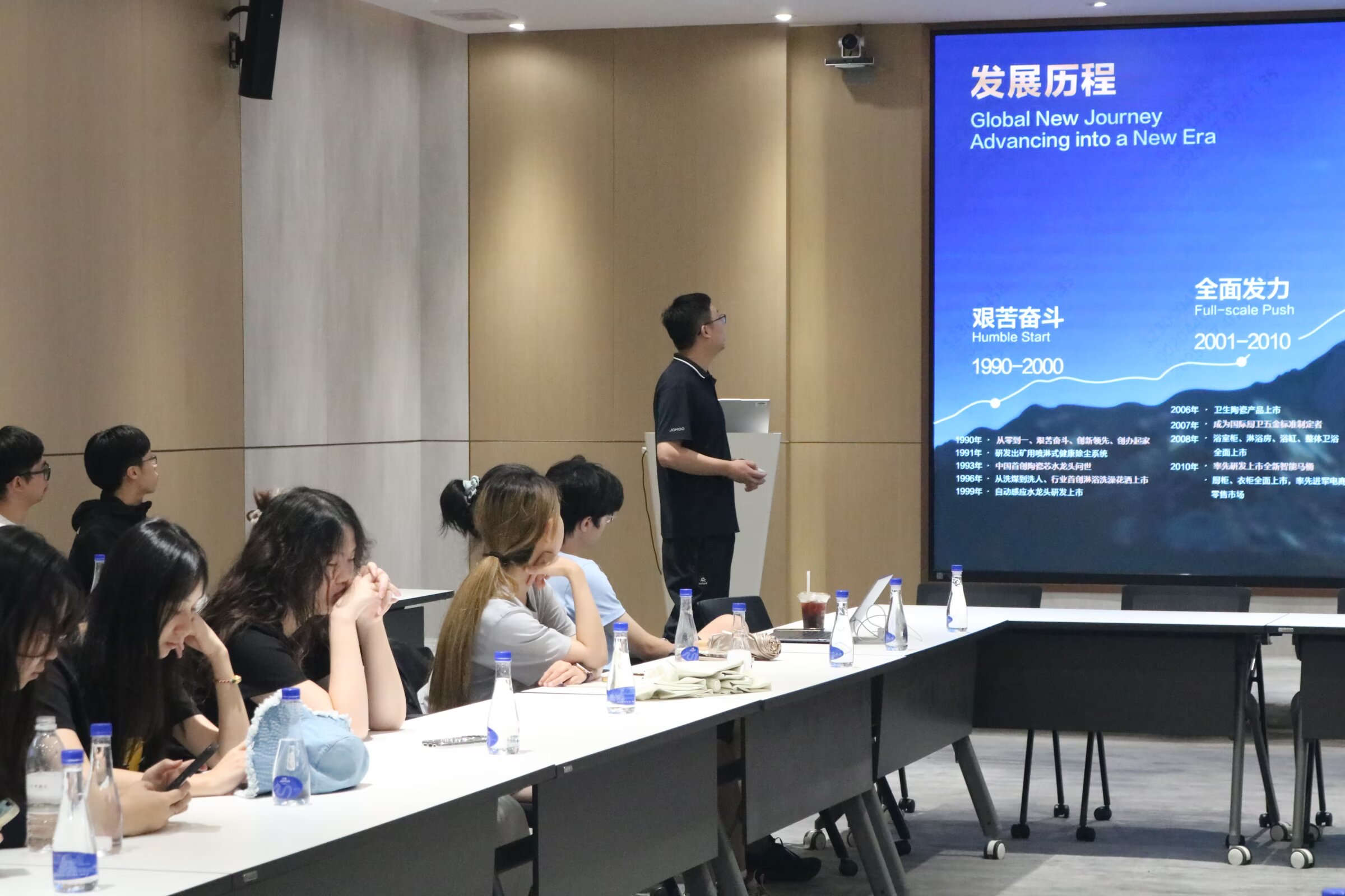 随后,同学们来到了九牧技术体验中心,从高端奢侈系列到日常实用款,针对不同销售群体、不同功能设计的产品一一陈列。同学们上手体验了例如马桶冲水量的大小、声控功能和九牧与华为联合推出的鸿蒙智联。在老师的介绍下,同学们深入了解九牧如何打造这样一个在卫浴方面“中国第一,世界前三”的品牌。真切感受到了科技与设计融合的魅力。