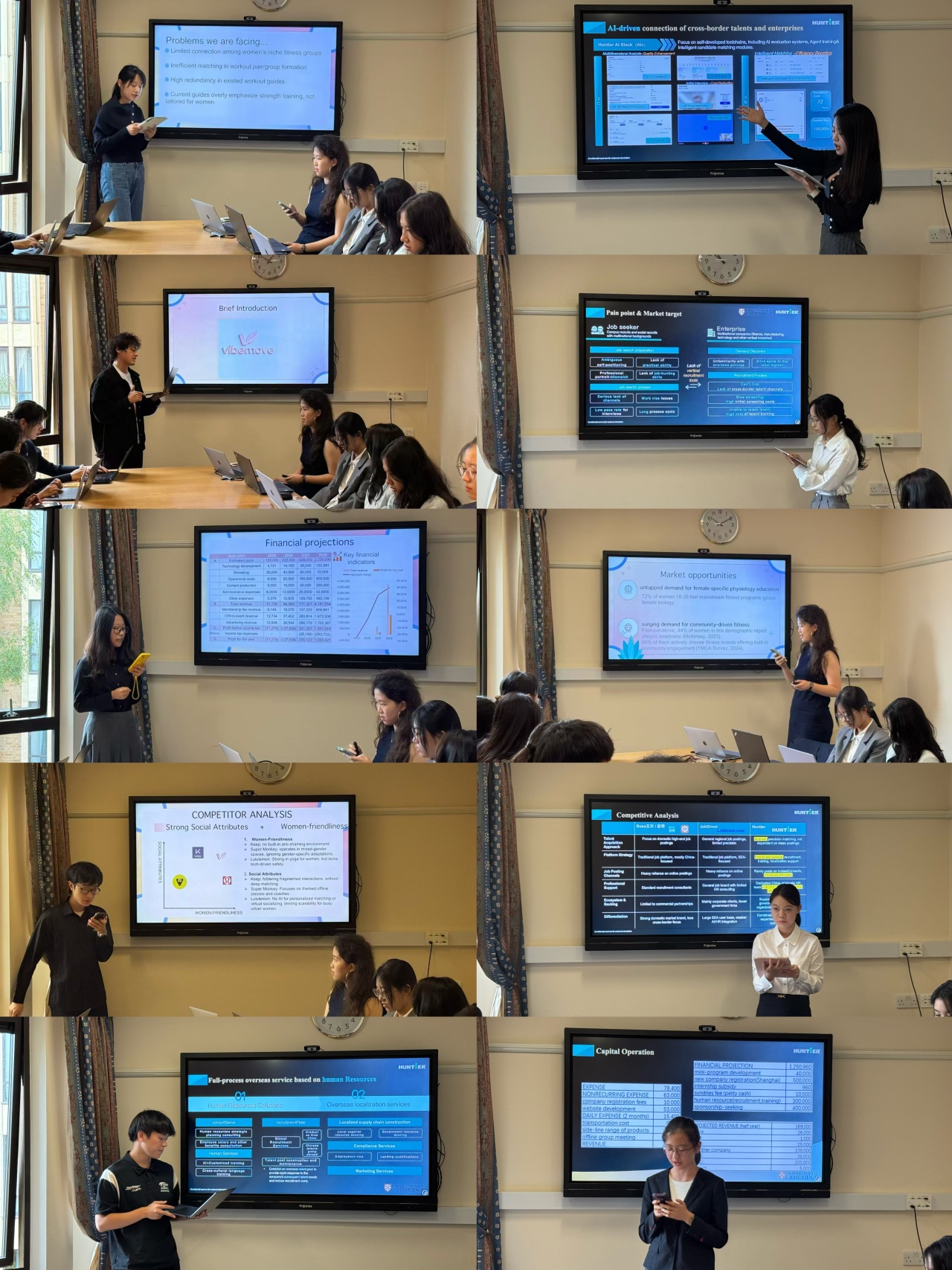 8月20日上午,创业项目终期汇报成功举行。本次汇报旨在检验同学们前期通过课堂学习、小组研讨和导师指导所形成的创业构想,并以模拟投资的形式进行综合呈现。两个小组分别聚焦留学生求职平台搭建及女性健身房创意设计两大主题,围绕市场需求分析、商业模式设计、技术实现路径、财务预测及风险管理等方面,各小组同学依次进行介绍。
