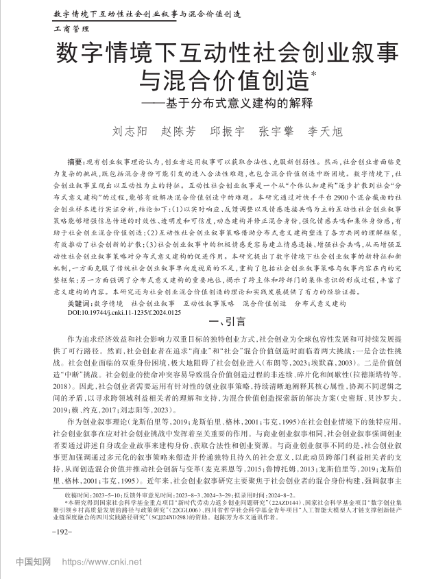 《管理世界》刘志阳、赵陈芳|数字情境下互动性社会创业叙事与混合价值创造——基于分布式意义建构的解释《管理世界》