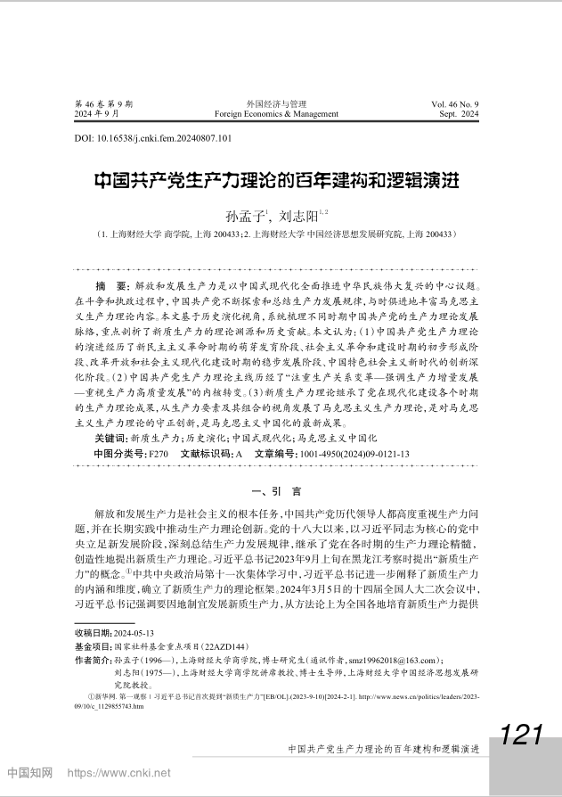 《外国经济与管理》孙孟子、刘志阳|中国共产党生产力理论的百年建构和逻辑演进