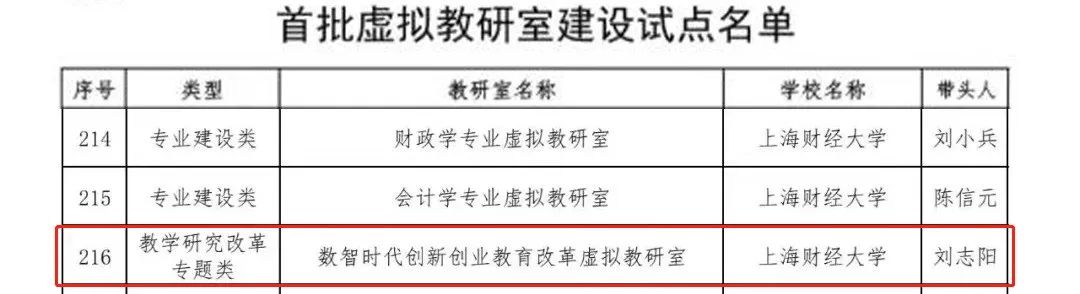 近日,教育部办公厅下发了《关于公布首批虚拟教研室建设试点名单的通知》,正式公布教育部首批虚拟教研室试点名单。上海财经大学3个虚拟教研室入选,其中刘志阳教授领衔的“数智时代创新创业教育改革虚拟教研室”获批教育部教学研究改革专题类首批虚拟教研室试点建设项目,这是我院数智时代新型基层教学组织建设的重要突破。