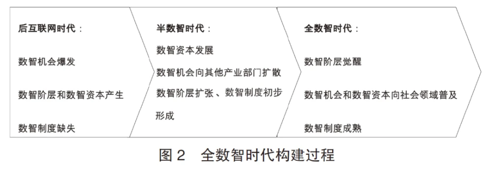 数智时代的构建并非一蹴而就。数智创业理论认为,应该创造性编排和组合数智机会、数智资本、数智阶层以及数智制度等要素,将创业活动与数智技术进行全方位的有机耦合,这是互联网时代向数智时代转型的基本前提。具体来说,由互联网时代走向全数智时代大致需要经历三个阶段:一是后互联网时代,是由数智机会驱动的数智技术产业化的过程。这一时期数智机会大量涌现,传统互联网阶层和产业资本开始注意到数智机会的潜在价值和市场空间,积极投入到数智机会的开发和占有行动中,催生了数智创业活动的爆炸式增长,推动了以数智技术为核心的数智产业的形成,并成为一种新的产业形态。在这个过程中,一部分互联网阶层完成向数智阶层的初步转变,一部分产业资本开始分离出数智资本。但与此同时,传统社会制度无法适应和承载大量的数智创新活动,其与日益增长的数智创业活动矛盾不断加剧,社会对构建一整套全新的数智制度的需求愈加迫切。二是半数智时代,是由数智资本驱动的全行业数智化的过程。数智资本伴随着数智产业的成熟而快速增长,同时向经济各部门渗透和发展,带动数智阶层在其他经济部门挖掘和甄别数智机会,带动数智技术超越本产业领域向全行业的应用和扩散。数智资本驱动下的数智经济全面扩散并呈现爆炸式增长,催生了大量的“数智+传统产业”的创新活动,加速了全行业向数智化生产服务的转型,数智技术与经济各部门实现无缝跨界融合。数智创新创造动能在充分释放的同时,也使得数智制度逐步完善,社会制度与数智创业的矛盾在一定程度上得到缓解。三是全数智时代,是由数智阶层驱动的全社会数智化的过程。在数智制度保障下的数智阶层已不满足于经济领域的数智创业活动,开始寻求解决社会文化领域的数智机会,并引导和带动数智资本超越经济层面的投资,转向社会文化层面的价值创造。通过数智技术在经济、社会、文化层面的全面应用,数智制度得以全方位完善,实现了社会制度与数智创业的和谐共生,即新的技术-社会范式的形成,如此全数智时代最终到来。