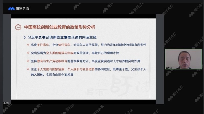 王占仁教授通过梳理中国高校创新创业教育的4个阶段为切入点,对2021年国办发35号文件《关于进一步支持大学生创新创业的指导意见》里从8个未来大学生创新创业主要路径进行详细解读,并通过“广谱式”创新创业教育的类型及原则进行了详细介绍,探讨了如何破解中国高校创新创业教育面临“三大矛盾”等观点进行了阐述。