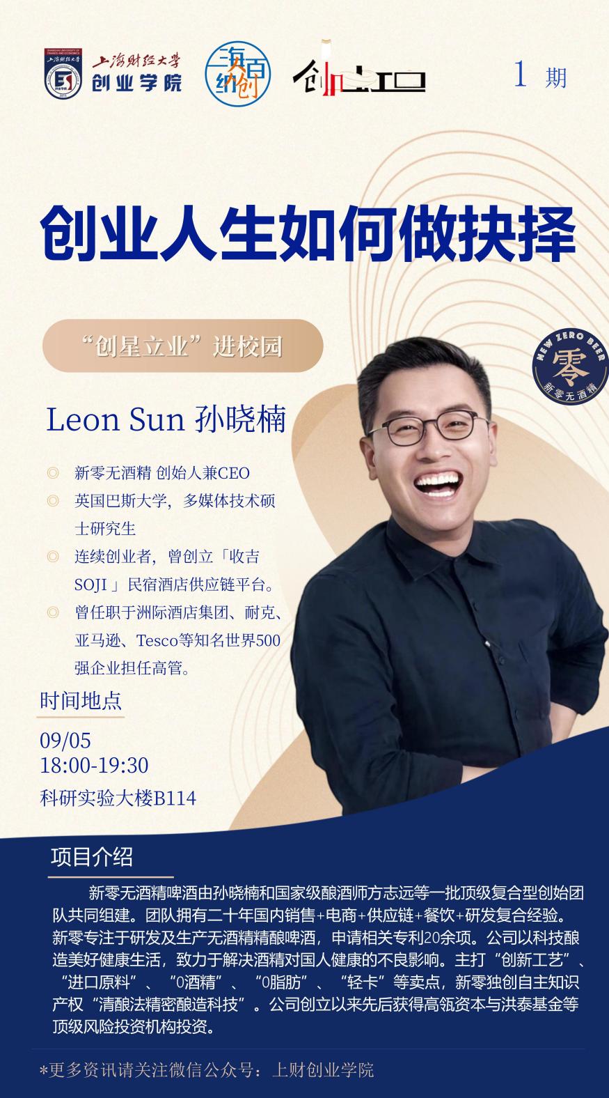 9月5日,上海财经大学创业学院与虹口区就业促进中心联合举办的“创星立业”进校园系列活动邀请到新零无酒精创始人兼CEO孙晓楠做客上海财经大学《创业中国》线下课堂,与财大师生一起分享创业经验。