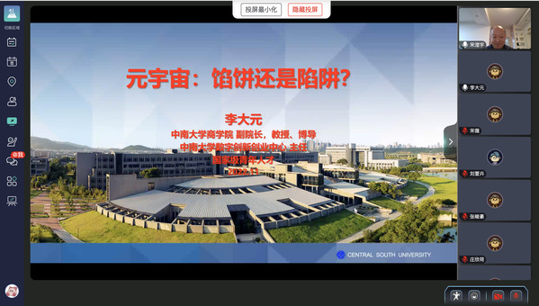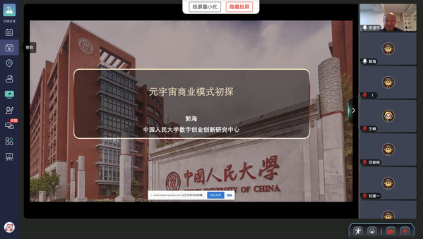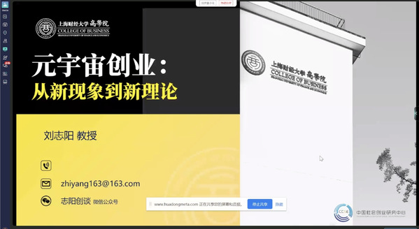 本次元宇宙创业研讨会由上海财经大学创业学院主办,中国社会创业研究中心承办,中国高等教育学会创新创业教育分会支持,中国人民大学数字创业创新研究中心、中南大学数字创新创业研究中心和数智时代创新创业教育改革虚拟教研室协办。邀请到的嘉宾包括上海财经大学商学院副院长、创业学院执行副院长刘志阳教授、中南大学商学院副院长李大元教授、中国人民大学商学院郭海教授、因问科技CEO吴鹏和世纪互联副总裁张俢枫,《外国经济与管理》编辑部主任宋澄宇担任主持人。