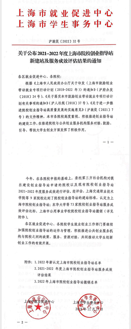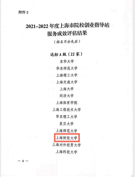 近日,上海市就业促进中心和上海市学生事务中心公布2021-2022年度上海市高校创业指导站服务成效评估结果,上海市共有9家院校达到了院校创业指导站的建站标准,73家院校创业指导站服务成效评估达标,其中上海财经大学评估结果为“A级”。我校已连续五年获评“上海市A级高校创业指导站”。